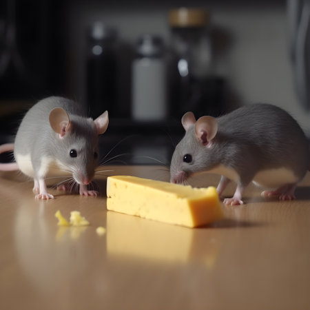 Gray mice approach a piece of cheese on the kitchen table, generative AI content.