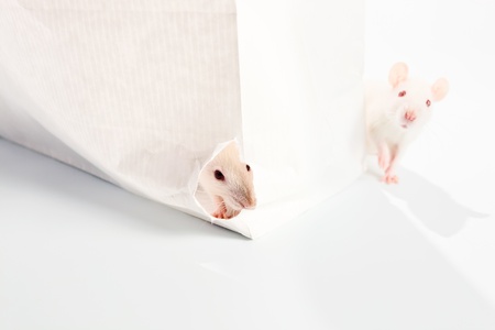 cute white rats examine a white bag