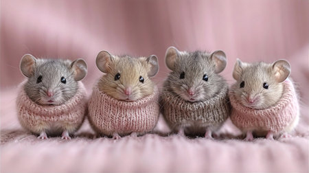 Three little gray rats in a knitted hat on a pink background