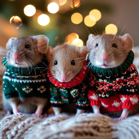 Three cute rat in Christmas sweaters on the background of the Christmas tree