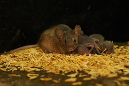 Little brown mouse mother and her baby in a nest of sawdust