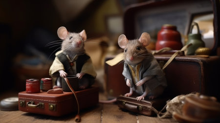 Two rats in a vintage suit sitting on an old suitcase and looking at the camera