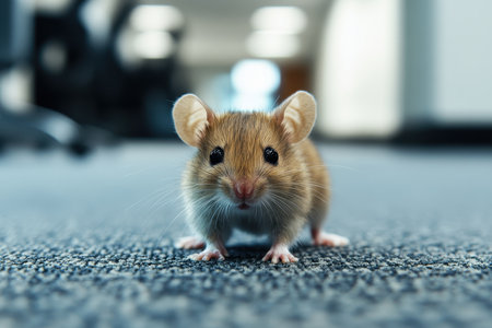 A small mouse with soft fur and bright eyes is curiously navigating the carpeted floor of an office. The setting has a clean, contemporary design with blurred backgrounds of office furniture.