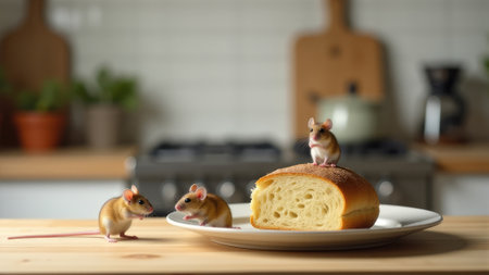 A group of small mice scurrying near a loaf of bread in a home kitchen, representing the issue of rodent infestations. This image captures the dangers of leaving food uncovered and the importance of maintaining kitchen hygiene to prevent pest problems.