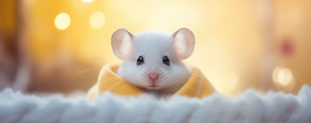 Cute small rat wrapped in yellow knitted plaid. Cute funny mouse under knitted blanket. Domestic pet