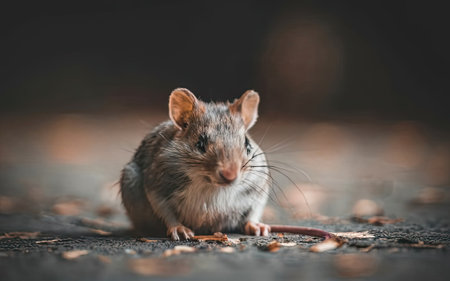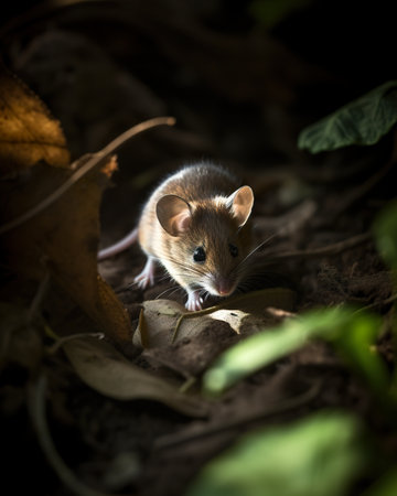 A small mouse sitting on top of a leaf covered ground. AI generative image