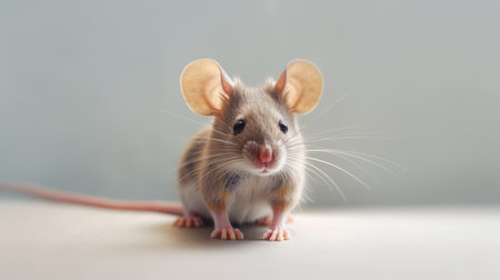 Comical white mouse with a surprised expression on grey background, ideal for educational purposes, humorous content, or pet-related advertising. Copy space for text. Surprised animal. Generative AI.