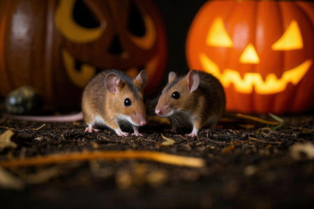 Two little brown mouse on a background of halloween pumpkins