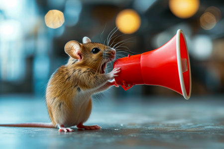 Mouse is holding red megaphone in its hand. Generative AI.