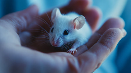 A small white mouse rests comfortably in the palm of a person's hand, its tiny features clearly visible. The setting is bright, emphasizing the mouse's soft fur.