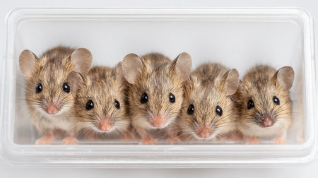 Group of small brown mouse in plastic box isolated on white background.