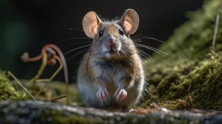 An AI generated illustration of a small mouse atop a lush mossy plant in a lush green forest setting