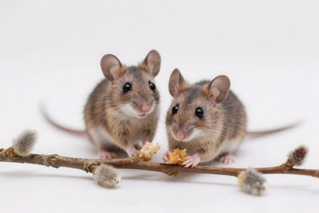 two brown mouse on a branch with catkins on a white background