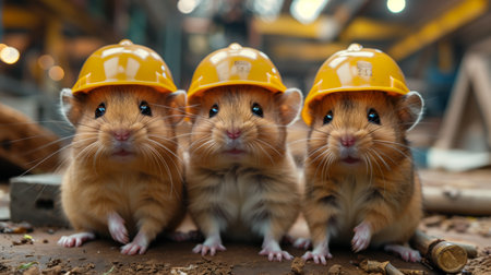 Hamsters in hard hats on construction site. Selective focus.
