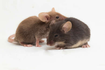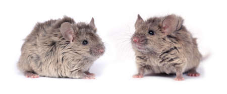 Two young mice in front of white background
