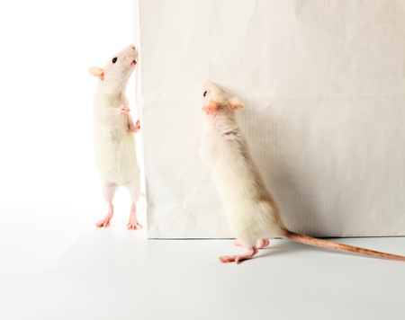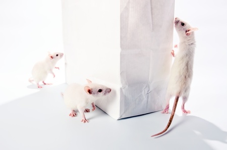 cute white rats examine a white bag