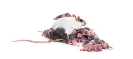 White laboratory mice: mother with pups, which are 9 days old; isolated on white