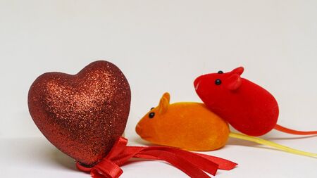 Saint Valentine's day. A pair of toy mice have sex next to a decorative heart.
