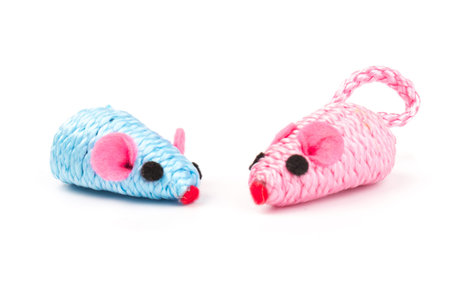 two blue and pink toy mice for a pet cat isolated on white background, close-up