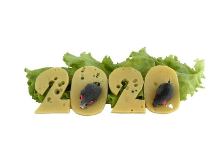 new year 2020 figures from cheese. the cheese lies on the lettuce leaves, isolated on a white background. on the cheese are figures of rats.