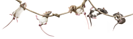Group of small, cute, baby domesticated pet rats climbing over eachother on a white background