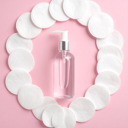 Clear liquid in a pump bottle encircled by cotton pads on a pink background. Clear details and vibrant colors...