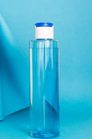 Gel sanitizer in a plastic bottle on a blue background. Coronavirus protection.