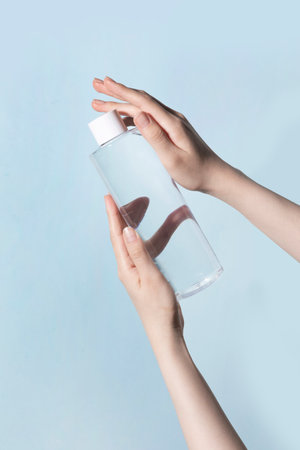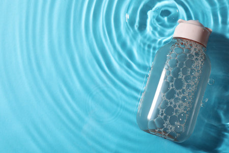 Bottle of micellar water in liquid on light blue background, top view. Space for text