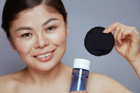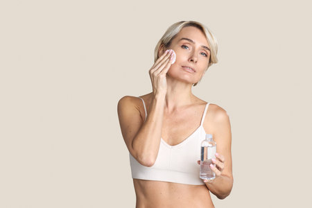 Caucasian middle aged woman cleansing face with cotton pad while holding bottle of skincare product, standing against plain background, demonstrating daily beauty routine