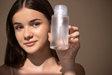 Female model with long dark hair displays a transparent skincare bottle, illuminated by soft light, highlighting beauty and self-care in a serene atmosphere