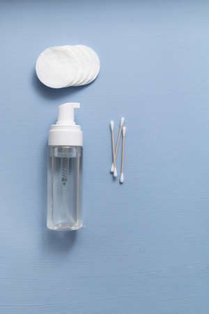 white cotton pads and organic cleansing foam on blue background, self care concept