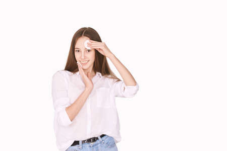 Pretty girl indoor portrait. Light background. Female teenager person. Long brow hair. Cleansing dirty skin. Remove mascara. Cotton pad near face