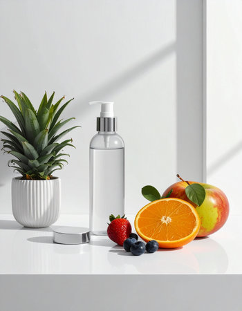 bottle of cosmetic product with fresh fruit on white table in room