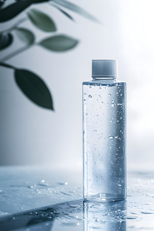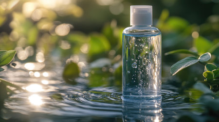 Bottle of hyaluronic acid skincare on water with sunlight reflections. Hydration theme with nature and purity. Close-up focus on water droplets.