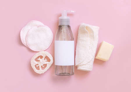 One pump Cosmetic bottle and eco-friendly skin care accessories on pink flat lay, copy space. Top view of natural beauty products for hair and skin care