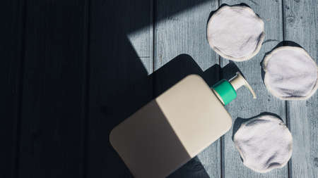 Cosmetic hygiene product in white bottle, reusable organic cotton pads for make-up remover on blue wooden background. hard daylight. Morning beauty routine. Zero waste lifestyle. Flat lay, copy space.