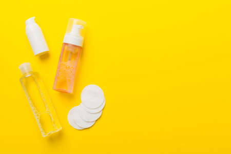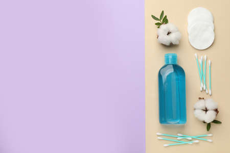Micellar cleansing water and discs to remove cosmetics and cleanse the skin on colored background. Copy space top view.