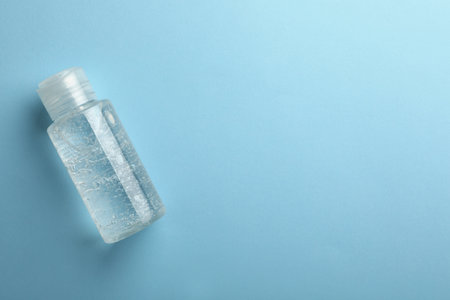 Bottle of cosmetic gel on light blue background, top view. Space for text