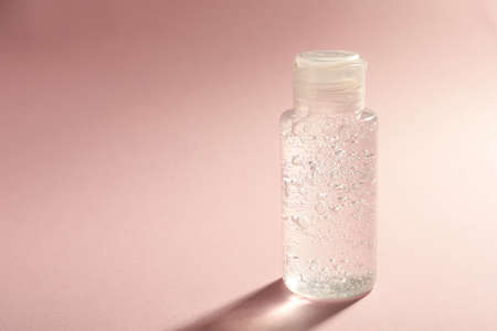Bottle of cosmetic gel on pale pink background, space for text