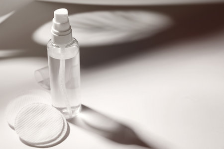 Bottle of micellar water and cotton pads on white table. Space for text