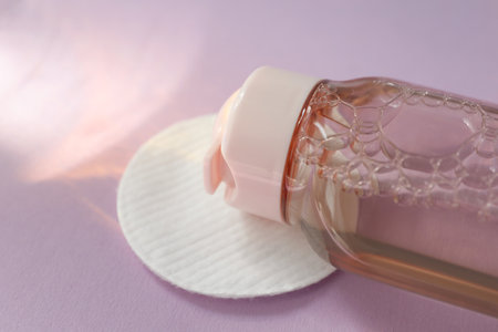Bottle of micellar water and cotton pad on pink background, closeup