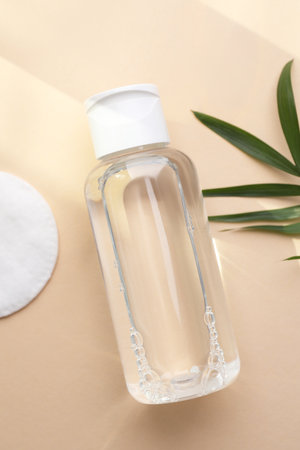 Micellar water and cotton pad on beige background, flat lay