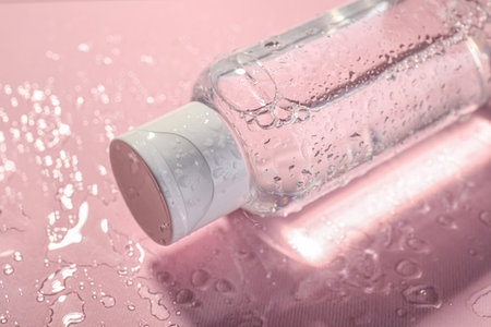 Wet bottle of micellar water on pink background, closeup