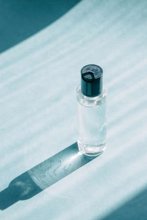 A jar of cosmetics, eco-friendly cosmetics. Transparent glass bottle of cosmetic perfume on a blue background.