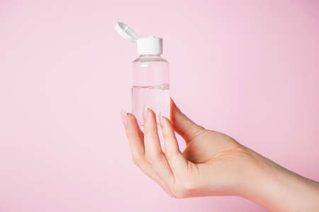 Medical hand sanitizer on a pink background with bottle cap, copy space. Spray for disinfection in the case of a coronavirus pandemic