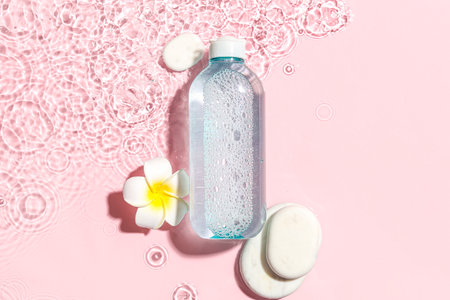 Bottle of micellar water with spa stones and plumeria flower in water on pink background