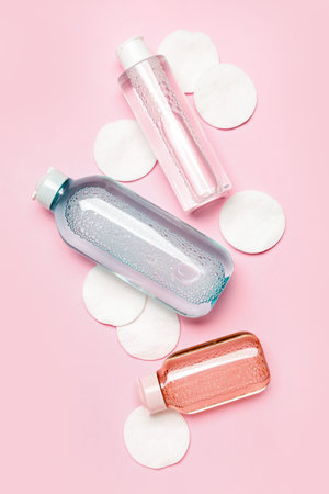 Bottles of micellar water with cotton pads on pink background