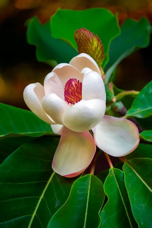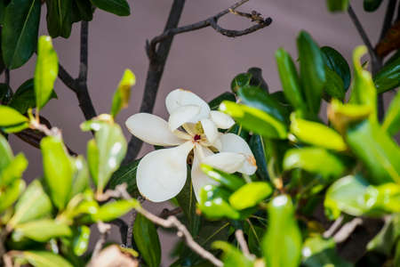 tender ripe white Magnolia flower blooming on a bright green tree with large leaves. Home garden with rare and beautiful plants