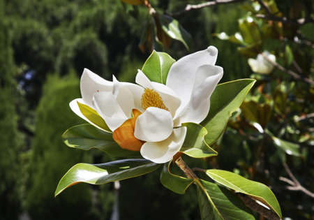 White magnolia flower close-up in botanical garden