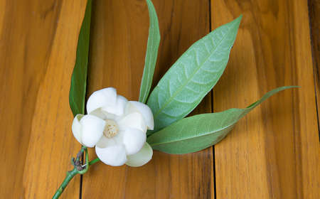 White Champaka are blooming on blue table background. (Michelia alba DC.)